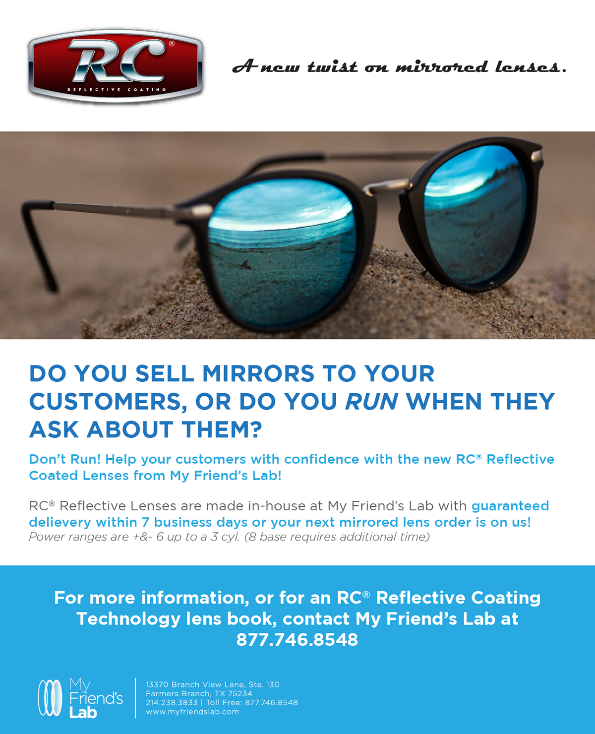 An ad designed to be mailed to optical offices or shipped with optical orders which speaks to the RC Reflective Coating brand of mirrored lenses offered by My Friend's Lab.